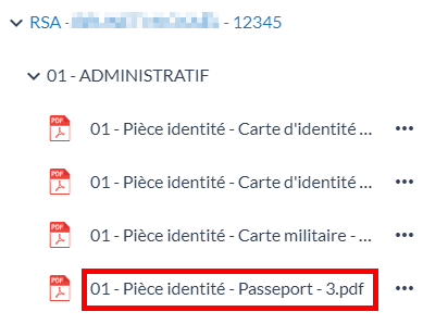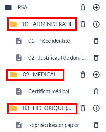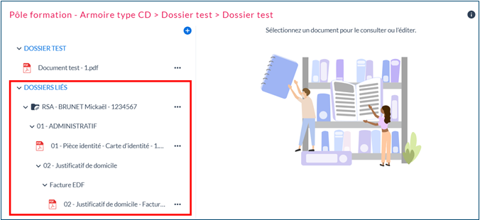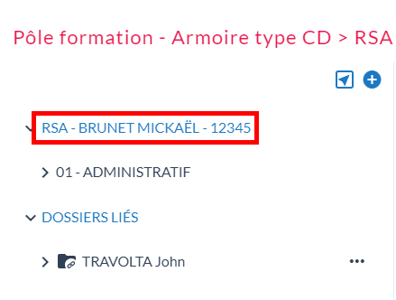 Exemple : on voit ci-dessus un dossier « RSA » lié au dossier « Dossier test ».