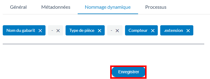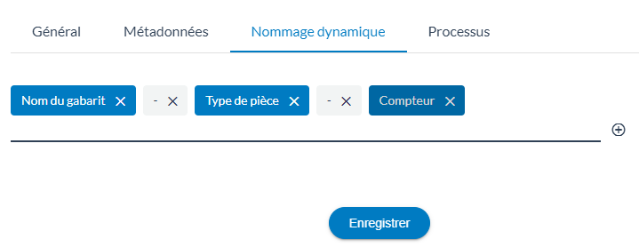 | Texte constant | Il s’agit d’une chaîne de caractères libre, qui peut être introduite par l’administrateur. Il suffit de la taper directement dans la barre de nommage dynamique et de la valider avec la touche « Entrée » du clavier. Dans l’exemple ci-dessous, on a ajouté le texte constant « - » au milieu de la règle pour séparer le « Nom du gabarit » et le « Compteur » : |