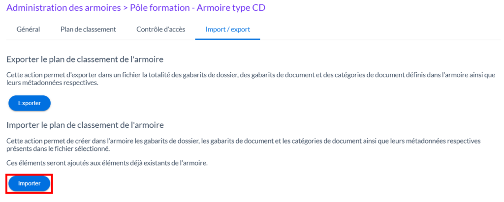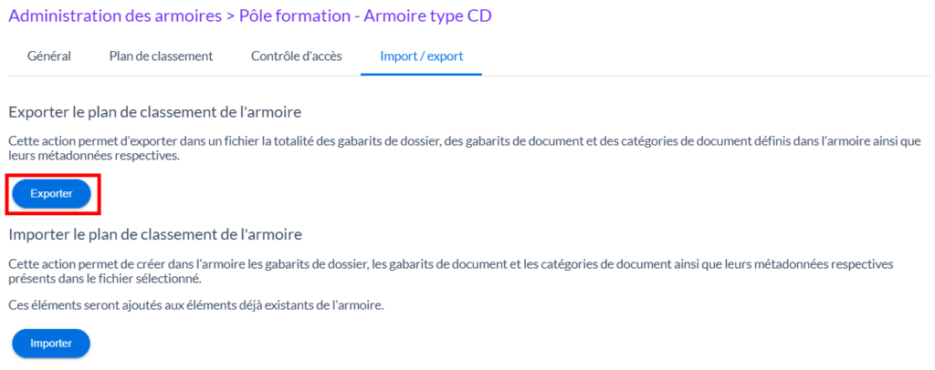 L’onglet « Import / Export » permet d’effectuer des transferts de plan de classement entre deux armoires. Cela peut être utile dans les situations suivantes :