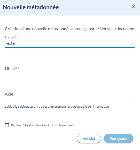 | Rendre obligatoire la saisie lors du classement | Le renseignement de la métadonnée par l’utilisateur est obligatoire. Il n’est pas possible de valider le classement du document tant qu’elle n’est pas saisie. |