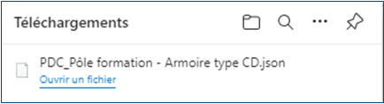 Cette manipulation a pour conséquence le téléchargement sur le poste d’un fichier au format JSON, qui contient l’ensemble des informations relatives au plan de classement de l’armoire (gabarits de dossiers, gabarits de documents, métadonnées…).