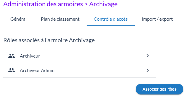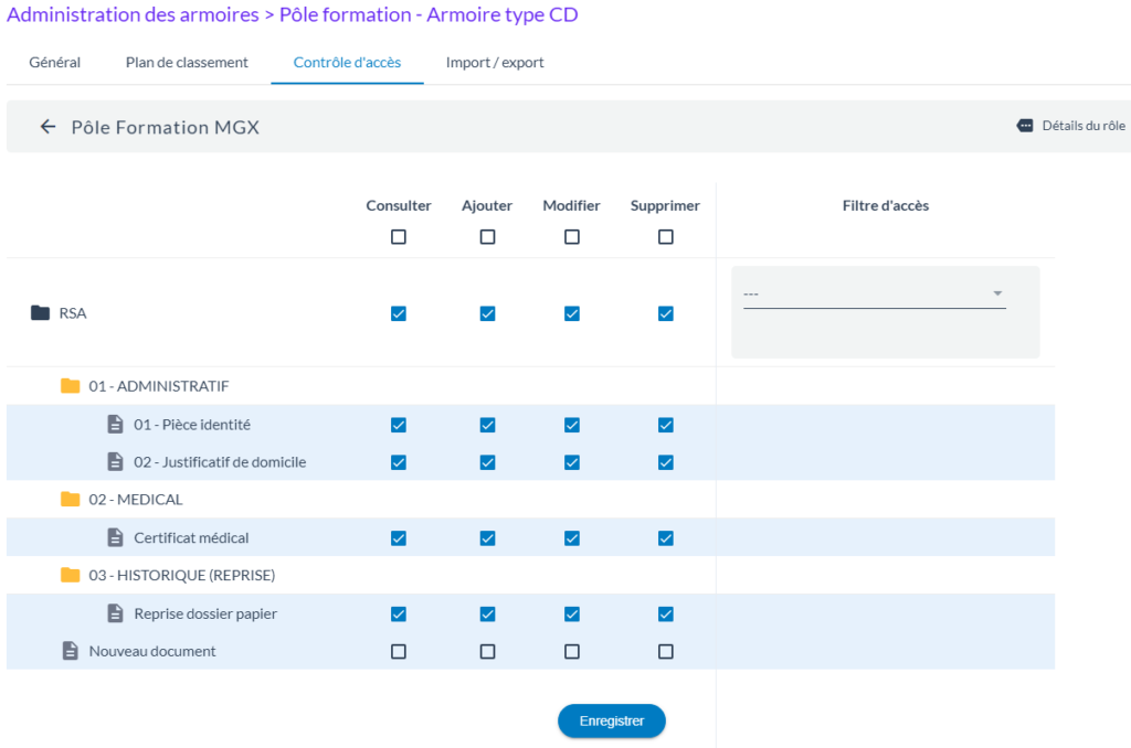 - L’onglet « Contrôle d’accès » définit les habilitations des différents rôles sur les dossiers et les documents de l’armoire