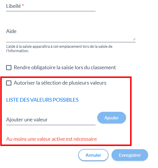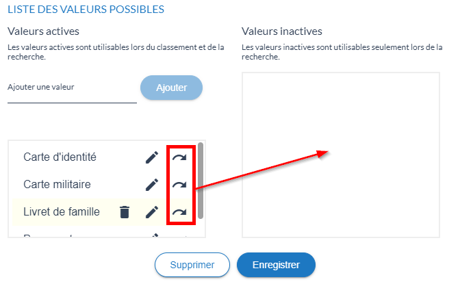 En modification, on a même la possibilité de désactiver certaines valeurs. Cela permet de ne plus les proposer aux utilisateurs au moment de la saisie, sans pour autant les supprimer complètement. Ainsi, les anciens documents pour lesquels cette valeur a été choisie du temps où elle était active conservent la valeur en question.
