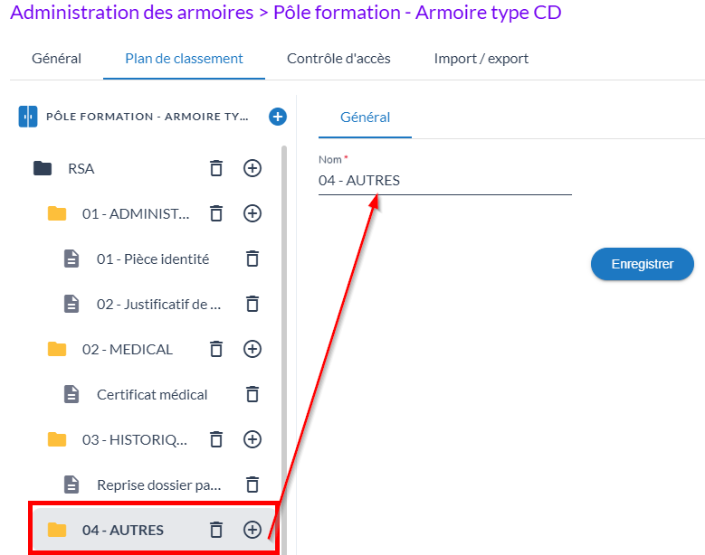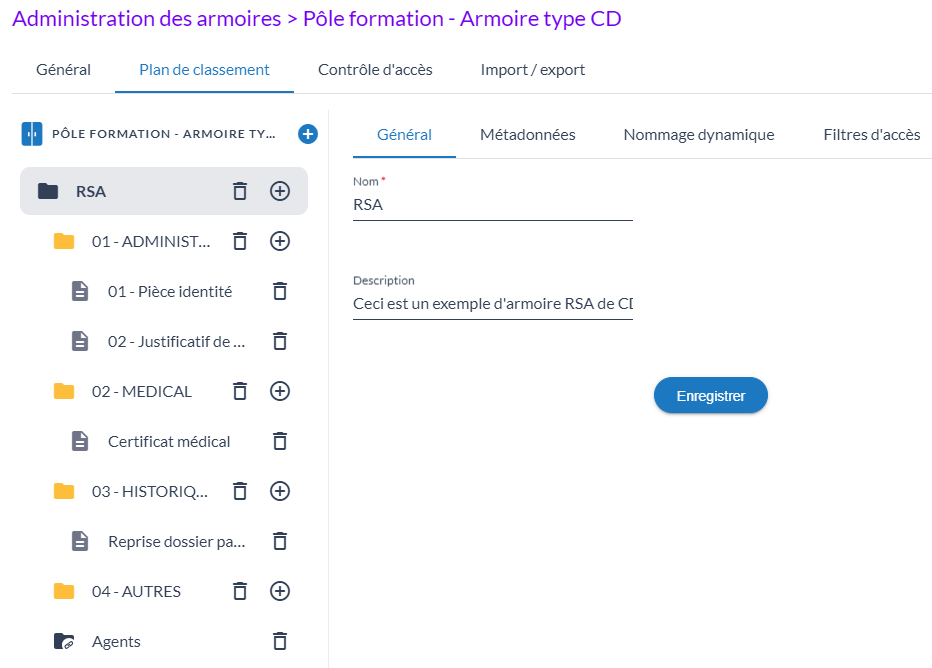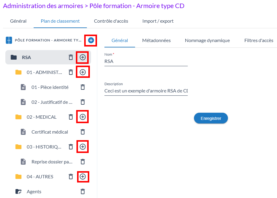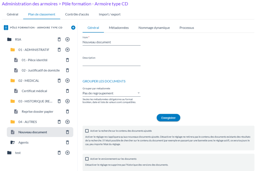 - L’onglet « Plan de classement » permet de définir la structure des éléments contenus dans l’armoire (dossiers, documents et leurs métadonnées)