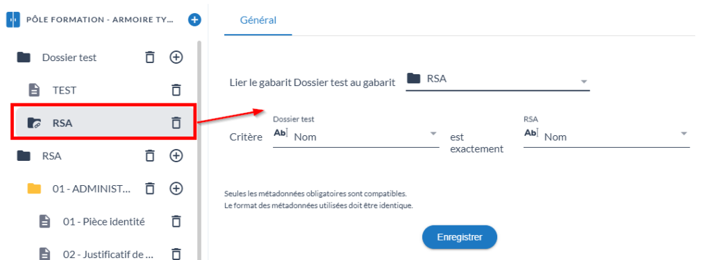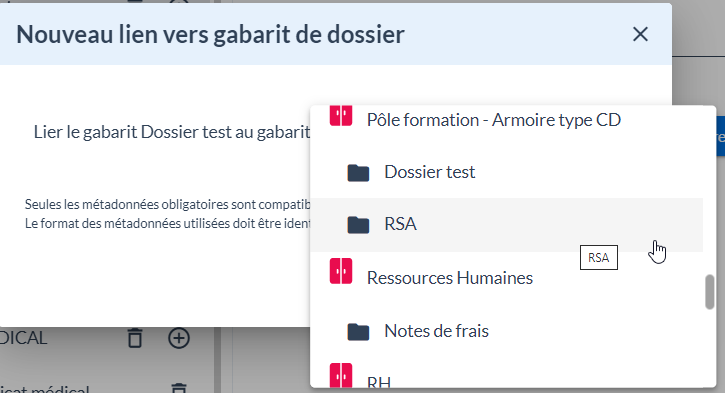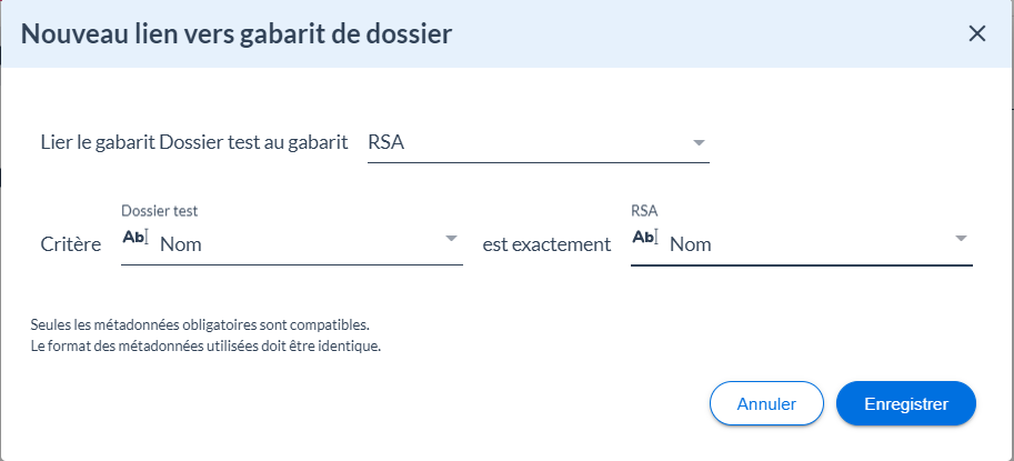 Exemple : On est ci-dessus en train de paramétrer un lien entre le gabarit de dossier « Dossier test » et le gabarit de dossier « RSA ». On considérera que deux dossiers doivent être liés entre eux si la valeur de la métadonnée « Nom » du dossier « Dossier test » est égale à la valeur de la métadonnée « Nom » du dossier « RSA ».
