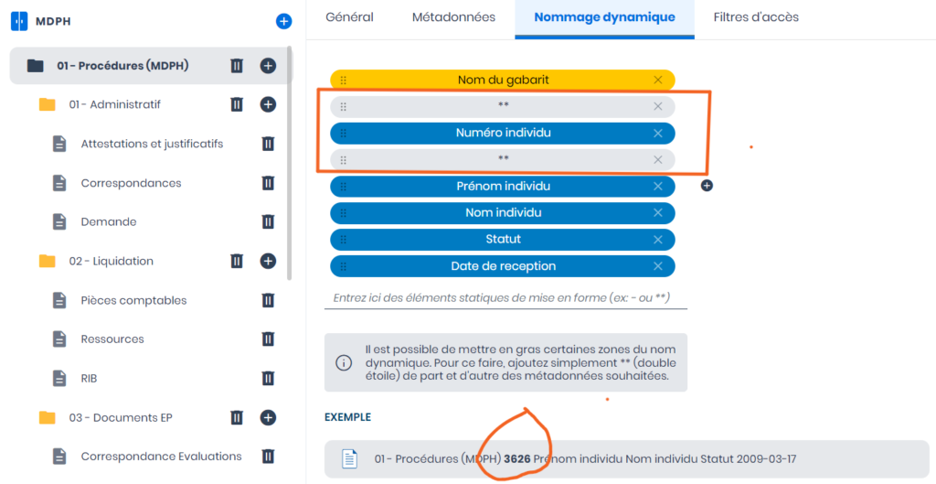 | Compteur | Il s’agit d’un compteur, qui s’incrémente à chaque nouveau document classé dans le gabarit de document pour un même dossier. |