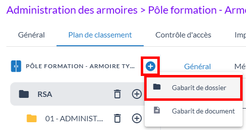 L’onglet « Plan de classement » donne accès à la gestion des gabarits de dossiers et de documents qui vont peupler l’armoire.