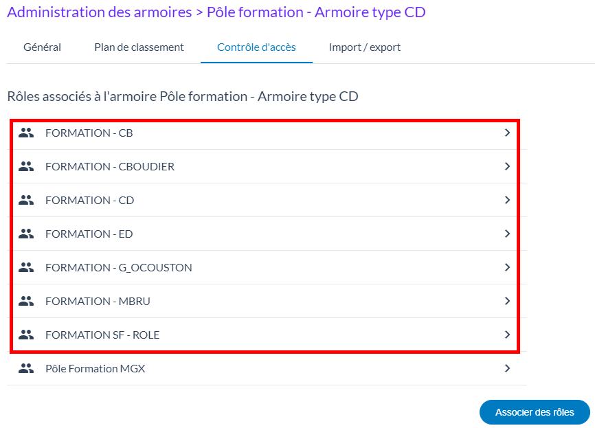 Les rôles ajoutés apparaissent alors dans la liste visible sur l’onglet « Contrôle d’accès » :