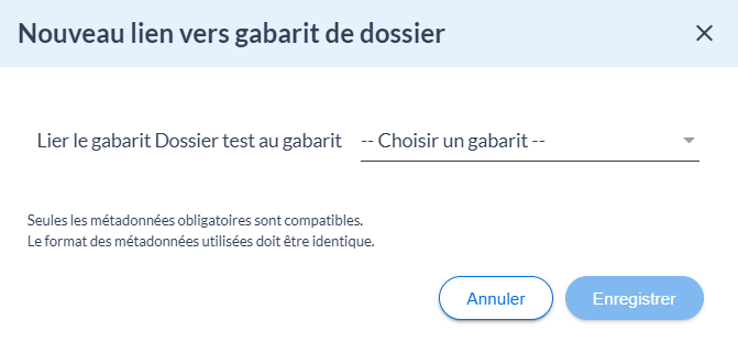 Il faut dans un premier temps choisir le gabarit de dossier à lier au gabarit de dossier en cours de paramétrage. Le choix du gabarit de destination est totalement libre : cela peut être un gabarit d’une autre armoire ou de la même armoire que celle du gabarit d’origine. Dans ce dernier cas, on peut même lier le gabarit de dossier à lui-même, si on souhaite lier entre eux des dossiers du même gabarit.