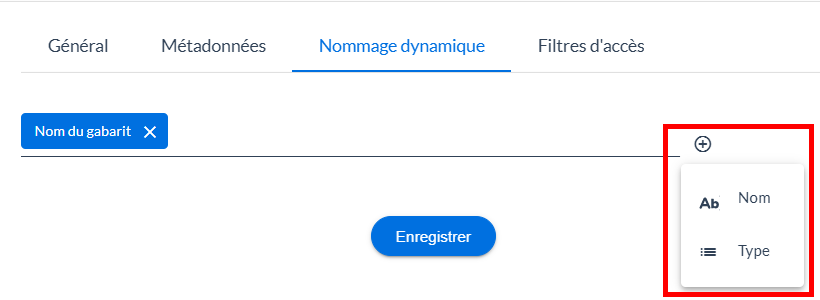 | Texte constant | Il s’agit d’une chaîne de caractères libre, au choix de l’administrateur. Il suffit de la taper directement dans la barre de nommage dynamique et de la valider avec la touche « Entrée » du clavier. Dans l’exemple ci-dessous, on a ajouté le texte constant « - » au milieu de la règle pour séparer le « Nom du gabarit » et la métadonnée « Nom » : |