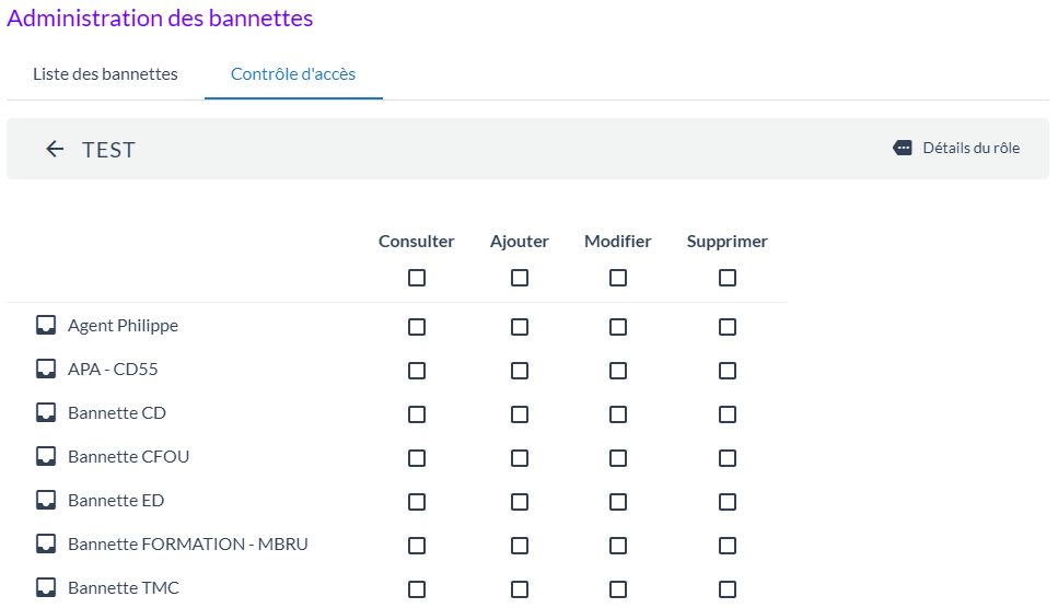 Il faut cocher les cases souhaitées pour octroyer au rôle (et donc à ses membres) des droits sur chaque bannette. Les niveaux de droits suivants sont possibles :