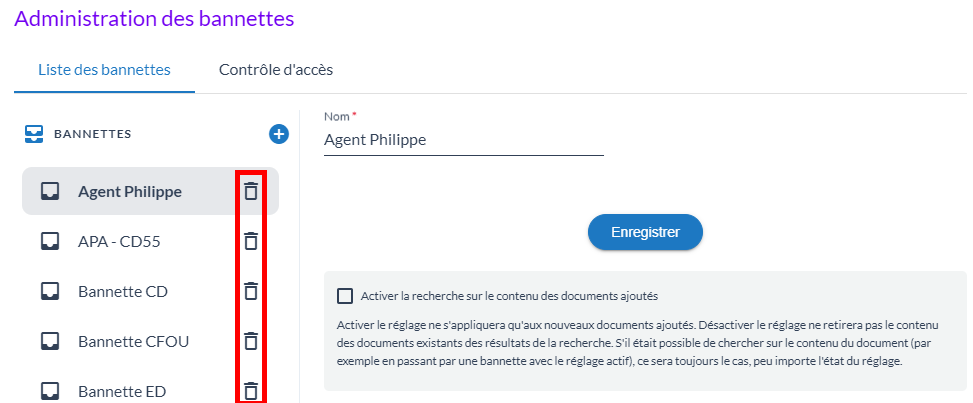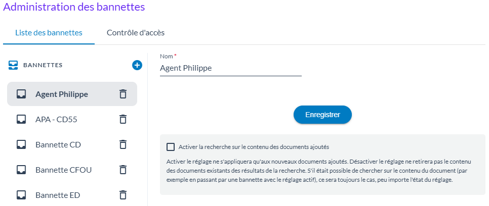 - L’onglet « Liste des bannettes » pour la création des bannettes et l’activation de certaines fonctionnalités sur les documents qu’elles contiennent