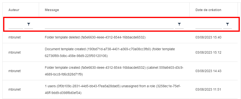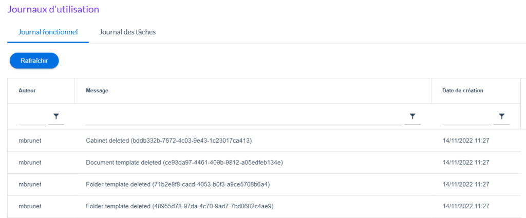 L’onglet « Journal fonctionnel » de l’interface donne accès à l’ensemble des actions manuelles réalisées par les utilisateurs et administrateurs fonctionnels dans Efalia Doc.