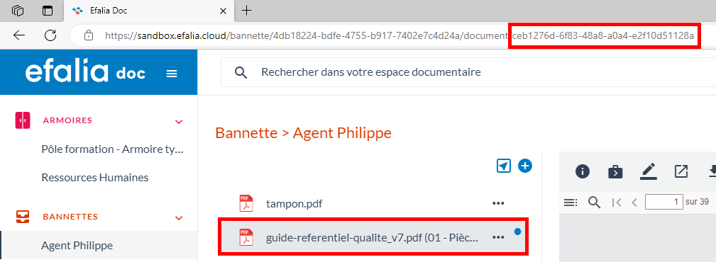 Attention ! Les dossiers et documents sont référencés par leur identifiant, qui est une chaîne de caractères alphanumérique peu explicite ! L’identifiant d’un document ou d’un dossier peut être récupéré dans l’adresse URL du navigateur lorsque celui-ci est sélectionné dans Efalia Doc