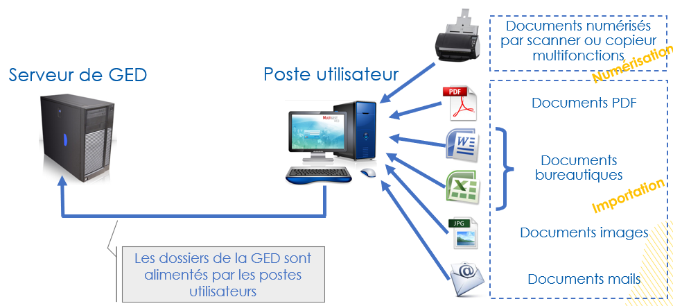 – Il peut s’agir de documents informatiques type PDF, image ou bureautiques (Word, Excel, Powerpoint…) présents sur les postes utilisateurs. On parle alors d’importation pour décrire le transfert de ces documents vers la GED.