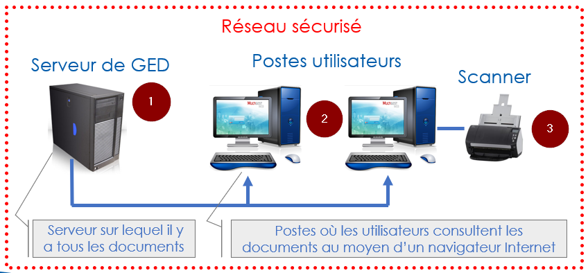 C’est sur ces postes que les utilisateurs peuvent rechercher et consulter les documents contenus dans la GED. La mise à disposition des documents sur les postes est possible car ceux-ci communiquent en réseau avec le serveur de GED (flèches bleues du schéma). La protection du réseau de votre organisation (pointillés rouge du schéma) permet par ailleurs de sécuriser l’accès à la GED. Un poste utilisateur externe au réseau ne peut pas échanger d’informations avec votre serveur de GED.
