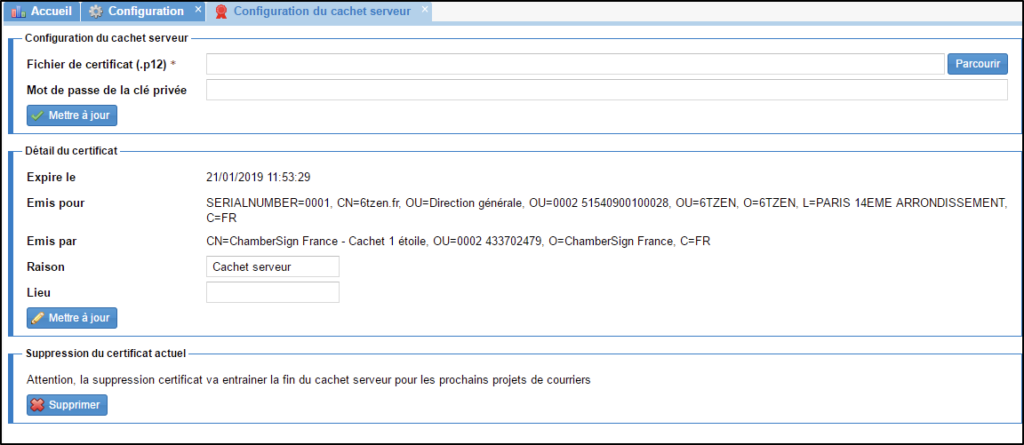 Cette fonctionnalité permet d’insérer un cachet serveur dans l’application, pour permettre la signature électronique des documents (paramètre).