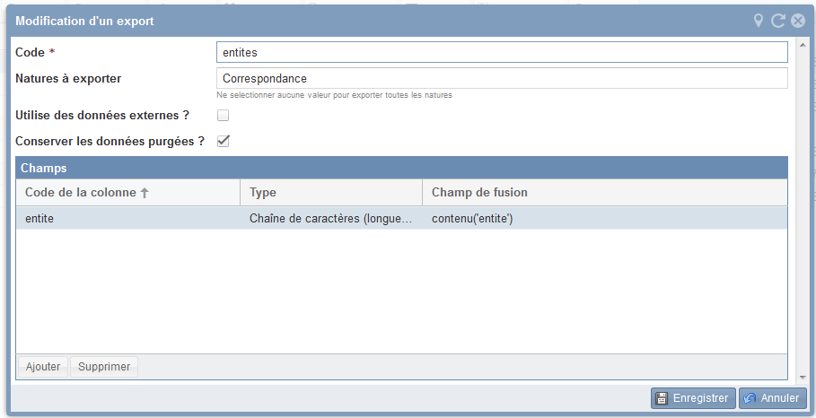 Les entrées Export dans la configuration globale permettent de créer des exports de données en s’appuyant sur des champs de fusion.