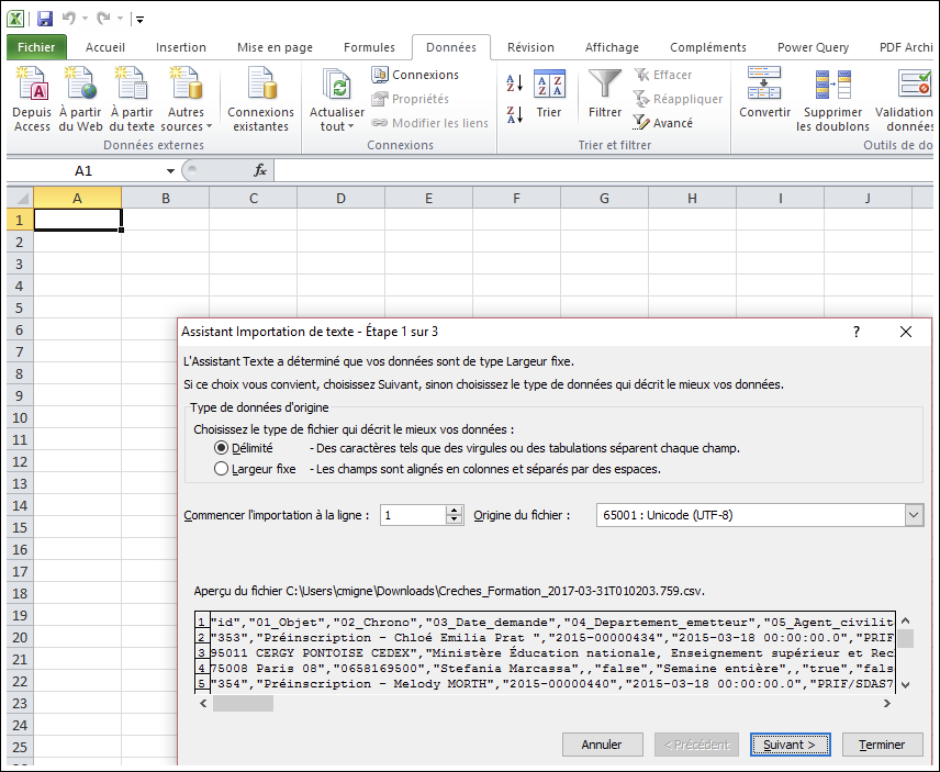 Si vous utilisez Excel : il est nécessaire d’ouvrir Excel au préalable, puis d’utiliser la fonctionnalité d’imports de données. (Menu « Données », sélectionnez « A partir du texte ». dans l’explorateur de fichier, chercher le fichier .csv exporté. Choisissez UTF-8 dans le champ « Origine du Fichier »). Il n’est toutefois pas conseillé d’utiliser Excel qui n’interprète pas les retours à la ligne.