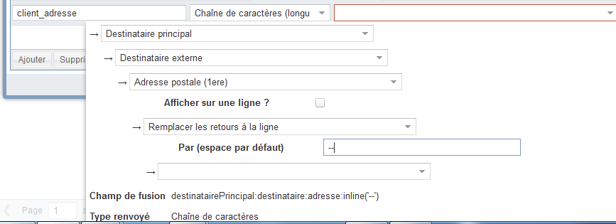 Pour cela, sur les champs texte susceptibles de contenir des sauts de ligne, prévoir d’ajouter à la définition du champ de fusion le modifier :inline(‘ — ‘).