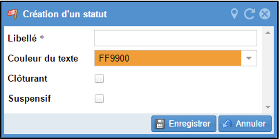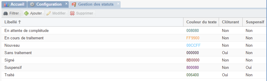 L’interface est accessible en cliquant sur « Statuts ». Les libellés par défaut s’affichent. L’utilisateur peut les modifier, en ajouter ou/et en supprimer.