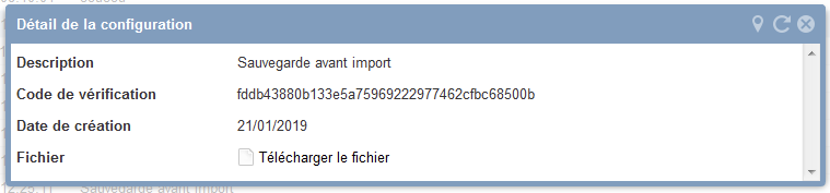 Cette entrée permet d’exporter/importer une configuration applicative d’une instance vers une autre (formation vers production par exemple). Cette opération se fait généralement sur demande de 6Tzen qui vous donnera les informations utiles.