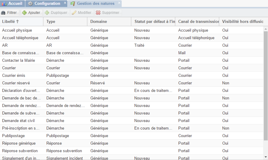 L’interface est accessible en cliquant sur « Natures ». Les libellés par défaut s’affichent. L’utilisateur peut les modifier, en ajouter ou/et en supprimer.
