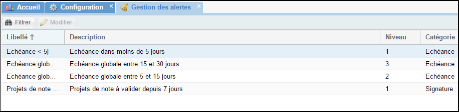 Cet onglet permet de gérer les messages associés aux différentes alertes paramétrées dans l’application.