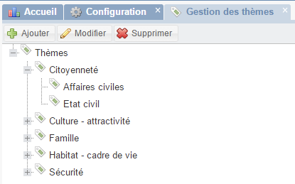 Cette fonctionnalité permet à l’administrateur de gérer les thèmes de façon arborescente. Il peut donc définir des thèmes disponibles pour le classement ou la recherche communs à l’ensemble des services.