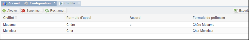 Permet de gérer les civilités disponibles dans l’application et les valeurs des champs de fusion associés (accord, formule de politesse…)