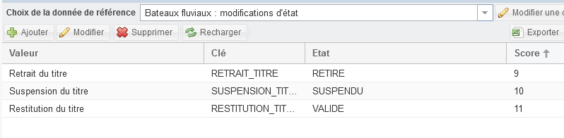 L’entrée « Données de référence simples » permet de gérer les listes de valeurs. Chaque liste (ou “catégorie”) comporte au minimum 3 colonnes : la clé, la valeur, et le score qui détermine l’ordre d’affichage. Une catégorie peut également comporter des paramètres supplémentaires qui seront utilisables notamment via les champs de fusion.