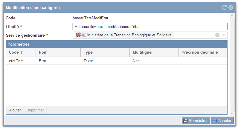 La modification d’une catégorie permet d’ajouter, modifier ou supprimer des paramètres et de modifier le libellé et le service gestionnaire. Attention à éviter de modifier les types et les codes des paramètres si des valeurs ont déjà été renseignées pour le paramètre concerné.