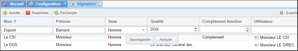 Cette liste permet de remplir le champ « Signataire » dans les projets de dossiers.