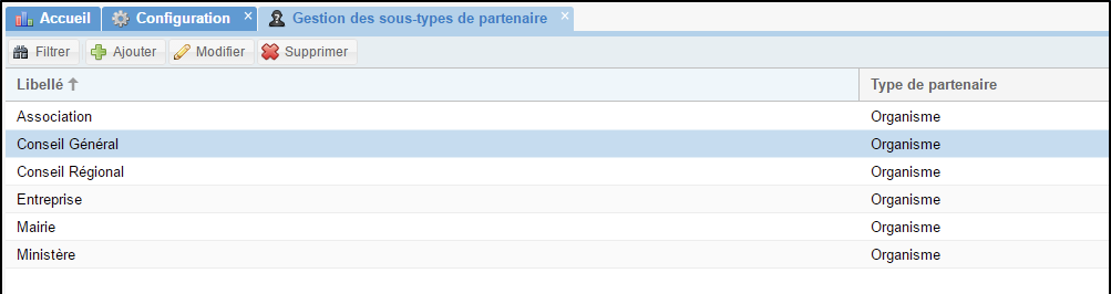 Cette entrée permet de créer des sous types aux types de partenaires existants. Exemple : il est possible de créer sous le type « Organismes » les sous-types « Mairie », « Association »… L’administrateur peut également modifier ou supprimer un sous-type.