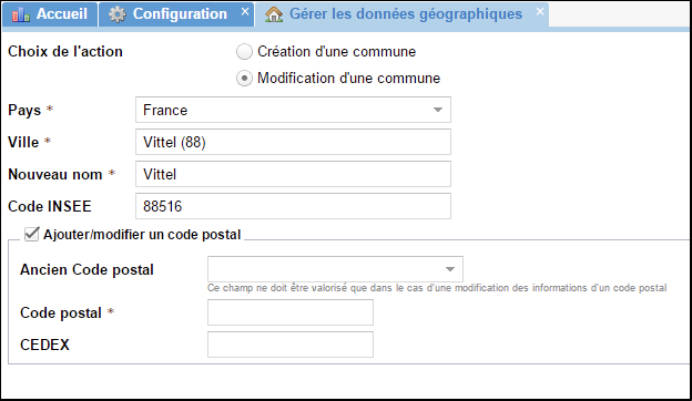 Il est possible de modifier uniquement le nom de la commune, de modifier aussi son code postal, et d’ajouter ou de modifier le cedex.