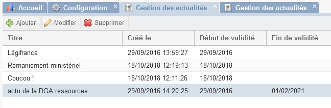 La gestion des actualités affiche la liste des actualités gérables par l’utilisateur connecté et lui permet d’ajouter, modifier ou supprimer des actualités.