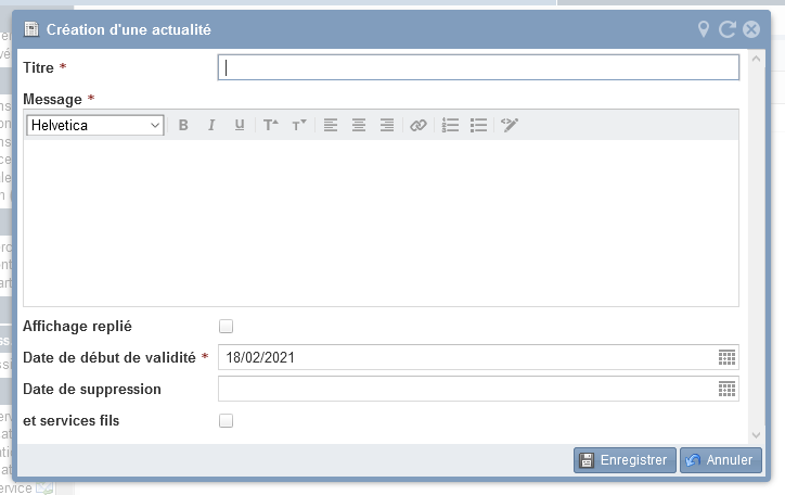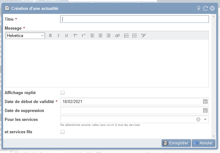 ▪ Les services auxquels s’adresse l’actualité. (si aucun service n’est renseigné, le message est visible par tous).