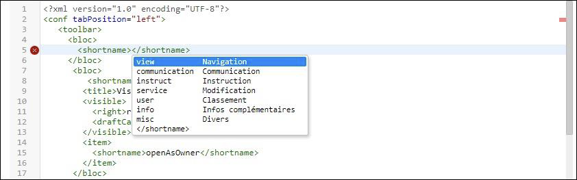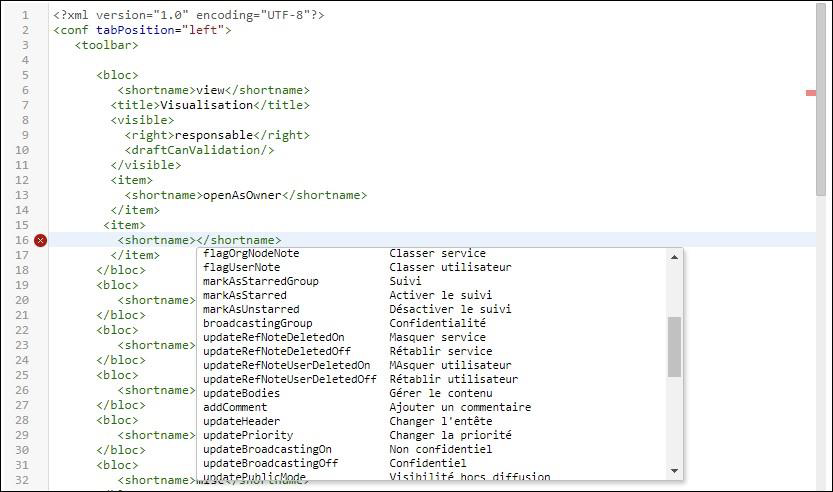 Aide à la saisie sur les items : taper CTRL+Espace entre les balises shortname permet d’afficher tous les items standards avec leurs title par défaut