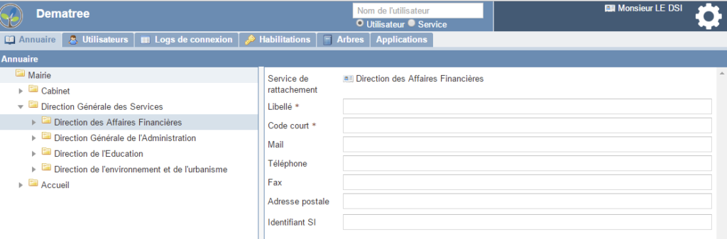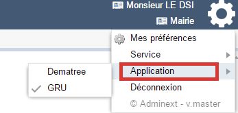 La gestion de l’organigramme, des utilisateurs et des profils s’effectue depuis l’application Dematree. Pour accéder à cette application, l’utilisateur doit changer d’application.