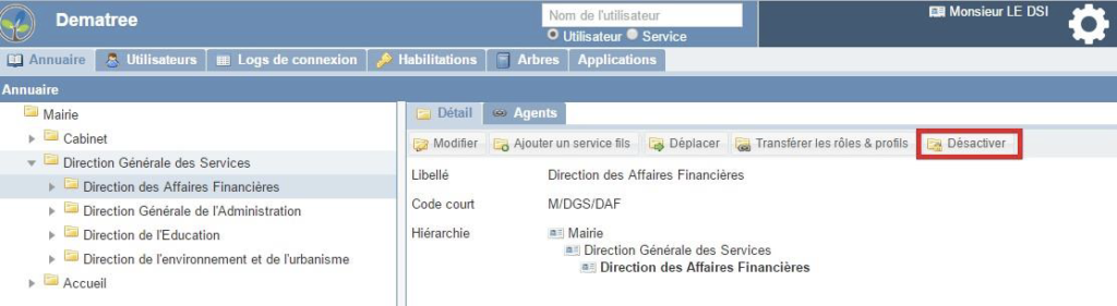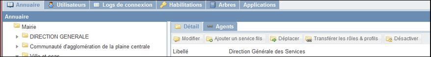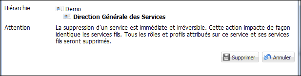 Le bouton « supprimer » n’est disponible que sur un service ayant été préalablement désactivé. La suppression d’un service supprime définitivement le service sélectionné, ainsi que tous ses services fils. Les utilisateurs rattachés à ce service ne sont pas supprimés, mais n’ont plus de service de rattachement s’ils ne bénéficiaient d’habilitations que sur le service supprimé. Il convient donc de leur attribuer un nouveau profil sur un autre service via l’onglet utilisateur ou habilitations.