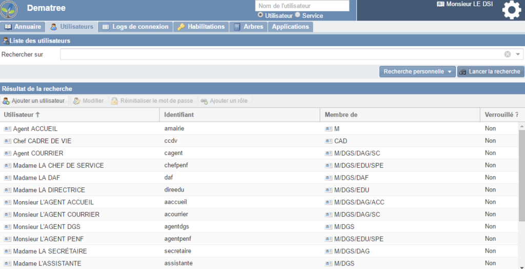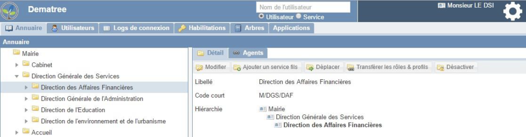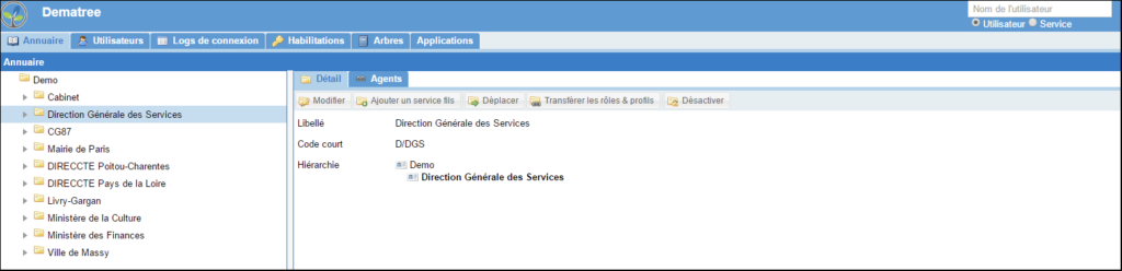 L’attribution de profils Dematree sur un périmètre restreint permet de créer des « administrateurs délégués », habilité à gérer les utilisateurs et les services sur une partie de l’organigramme.