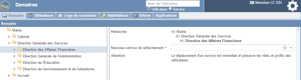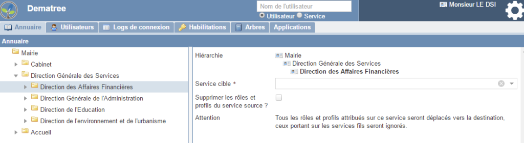 Le bouton « déplacer » permet de déplacer un service dans l’organisation en lui attribuant un nouveau service de rattachement.