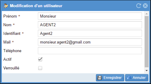 La modification d’un utilisateur offre les champs ci-dessus en modification. Si l’administrateur décoche la case « actif » le compte est désactivé et l’utilisateur perd toutes ses habilitations.