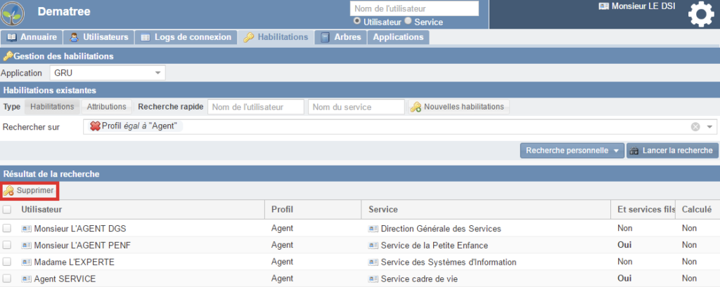 Il peut rechercher les utilisateurs selon plusieurs critères (profil, service, nom d’utilisateur). Deux boutons sont disponibles dans la barre d’état : « habilitations » et « délégations ».