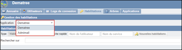 Pour gérer les habilitations des utilisateurs, l’administrateur se rend sur l’onglet « Habilitations ». En choisissant l’application 6Tzen, il va pouvoir gérer les profils et les délégations des utilisateurs sur les services. En choisissant l’application Dematree, il va pouvoir attribuer les profils Dematree aux utilisateurs.
