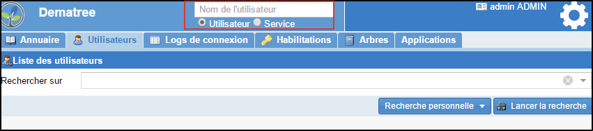 Un champ de recherche rapide sur les utilisateurs et les services est disponible en permanence sur l’interface.