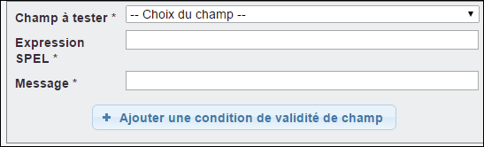 Message : message d’erreur à afficher au niveau du champ précité en cas de non-respect de l’expression SPEL à tester.
