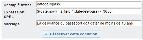 Dans une étape S2, il faut faire en sorte que l’usager choisisse dans le champ F3 « Date de délivrance du passeport » une date de moins de 10 ans. Mettre la condition de validité sur le champ F3 de l’étape S2 : ${date:now} – ${field:S2:F3} < 3650