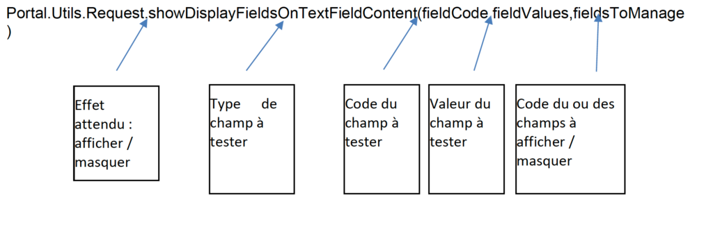 | Masquer un choix | Texte libre | Portal.Utils.Request.hideDisplayFieldOptionsOnTextFieldContent(‘fieldCode’,[‘fieldValue’], ‘fieldToManage,[‘fieldValue’]) |