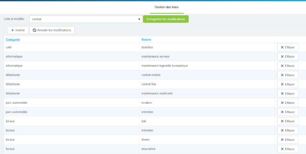 Cette table permet de gérer la catégorie et la nature d’un contrat